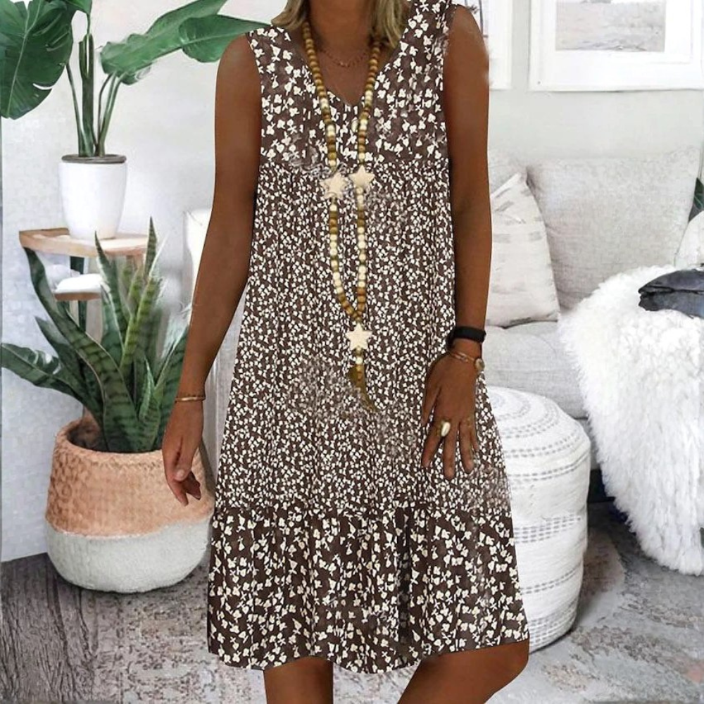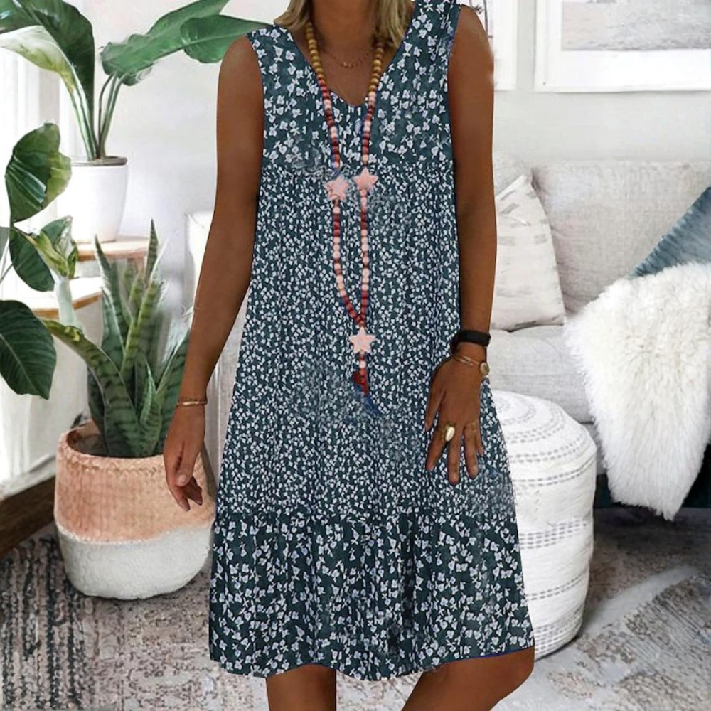 The Claire Dress blends feminine charm with relaxed comfort. Its sleeveless cut and flattering V-neckline make it a perfect choice for warm days, while the delicate floral print adds a soft, stylish touch that suits any occasion.