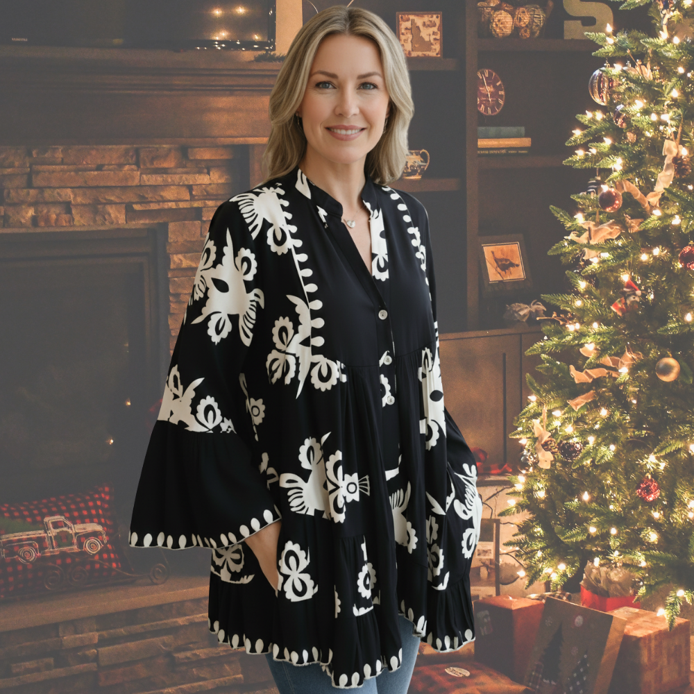 Style: Flowing tunic with refined detailing
